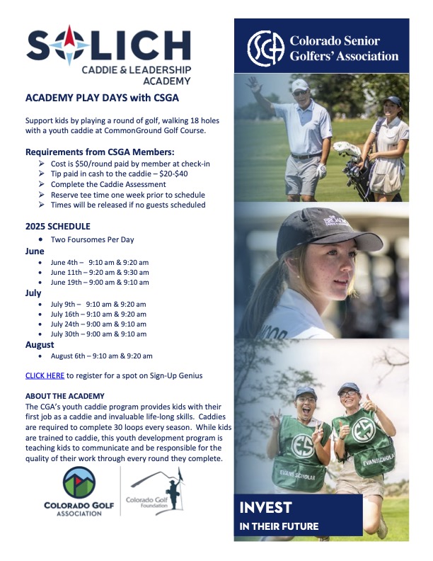 In 2024 the Colorado Senior Golfers’ Association donated $10,000 to establish the Colorado Senior Golfers’ Association Permanent Endowment within the Colorado Golf Foundation. The endowment’s purpose is to create a continuing source of funds to provide funding for Colorado-based golf organizations and programs that use golf to build important life skills and character, with an emphasis on instilling hard work and self-reliance in young people.